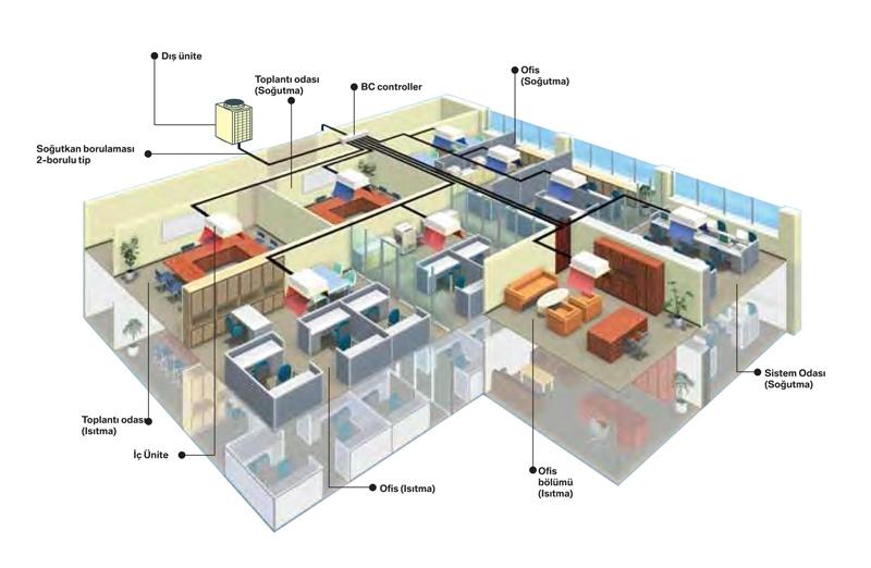 Bir dış ünite ile gaz akış dağıtıcıları yardımıyla birden çok iç ünitenin birbirinden bağımsız olarak kontrol edilebildiği direkt genleşmeli klima sistemleridir. Gerektiği kadar soğutucu akışkan doğru faz ve doğru zamanda ihtiyaç duyulan iç üniteye sevk edilerek ısıtma ve soğutmada kullanılması sağlanır. VRF ve VRV Sistemler kullanım alanları kontrollü bir kompresör veya kompresörlerle varyasyonlandırılarak, havası şartlandırılmış mekânlara göre soğutucu akışkanın uyum göstermesi sağlanır.
